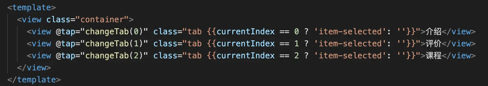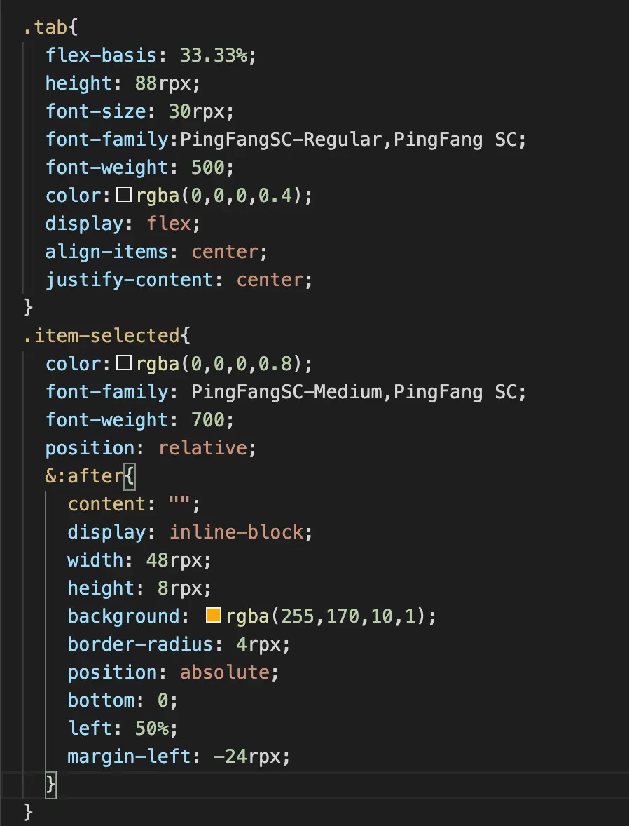 2.通过css伪类来实现,代码逻辑比较简单。通过当前选中的tab序号currentIndex为每个tab选择不同的类名,如果没有选中为item,选中为item-selected。
