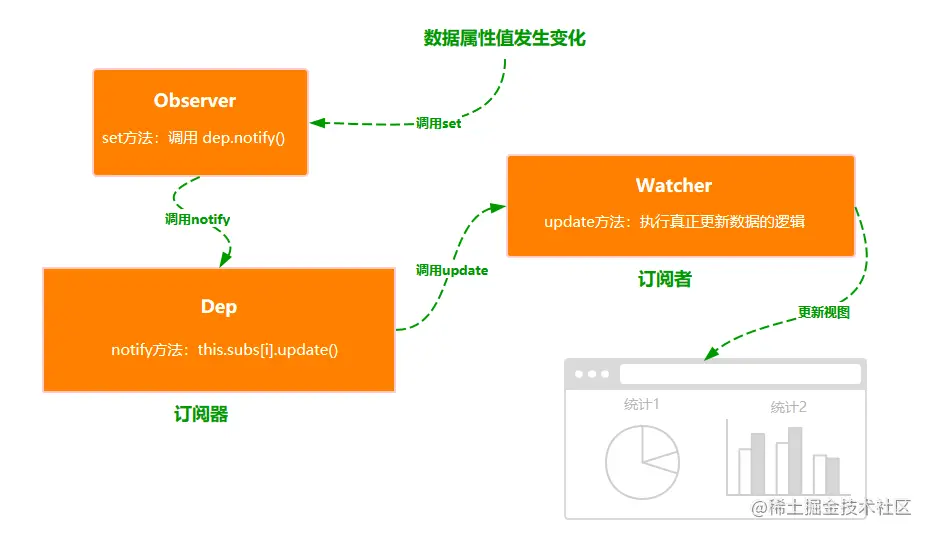 所以我们可以说双向数据绑定就是通过变化侦测这种方式去实现的,也可以说双向数据绑定是通过发布-订阅这种模式去实现的。我个人觉得两者说法都没有问题,只是描述方式不一样。