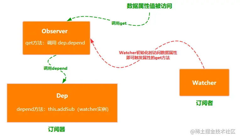 即创建Watcher实例,调用Watcher实例的get方法,从而触发数据属性上定义的get方法,最终触发dep.depend方法。