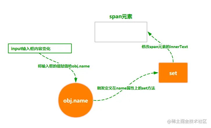 在监听输入框内容变化的逻辑中我们说过会将变化的数据保存到obj.name中。那这个操作实际上就是为对象的属性赋值,会触发定义在属性上的set方法。那么将输入框的内容同步到span的innerText属性这个操作,很自然的就落到了name属性的set方法中。