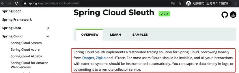 打开官网就可以看到对 Sleuth 的一个简单功能介绍。