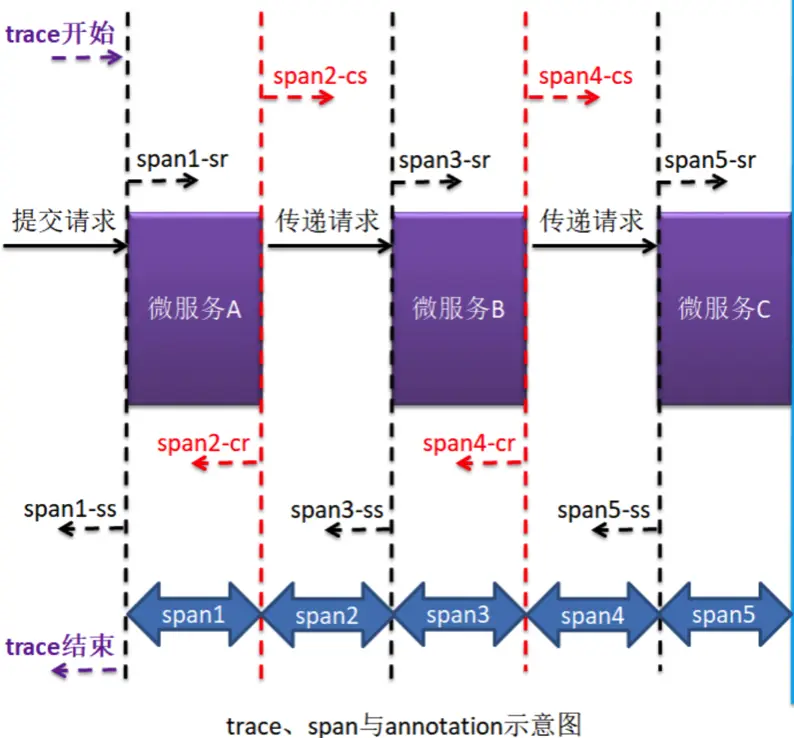 - trace:跟踪单元是从客户端所发起的请求抵达被跟踪系统的边界开始,到被跟踪系统向客户返回响应为止的过程,这个过程称为一个 trace。