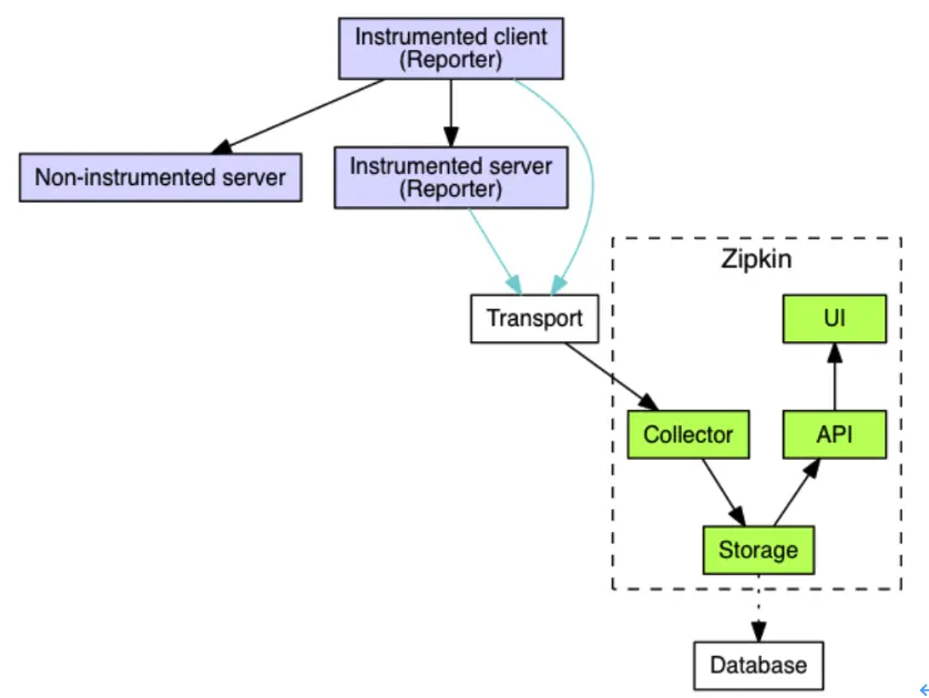 - Storage:存储组件,它主要用于处理收集器接收到的跟踪信息,默认会将这些信息存储在内存中,也可以修改存储策略,例如,将跟踪信息存储到数据库中。