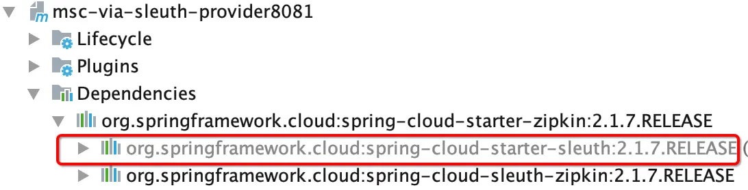 打开 spring-cloud-starter-zipkin 依赖,可以看到其已经包含了 spring-cloud-starter-sleuth 依赖,所以可以将原来导入的 sleuth 依赖删除。