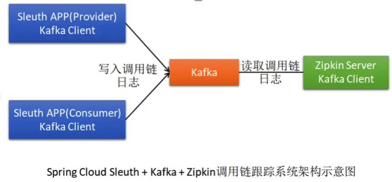 默认情况下,Sleuth 是通过将调用日志写入到 via 头部信息中的方式实现链路跟踪的, 但在高并发下,这种方式的效率会非常低,会影响链路信息查看的。此时,可以让 Sleuth 将其生成的调用日志写入到 Kafka 或 RabbitMQ 中,让 zipkin 从这些中间件中获取日志,效率会提高很多。