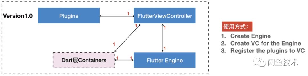 作为使用方,我们看不到Engine对象,因为Engine已经内置在FlutterViewController中,没有暴露出来。Flutter1.0做了解耦和改进,如下图: