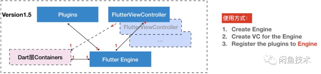 我们可以看到虽然全局还是仅有一个FlutterViewController实例,但FlutterEngine被单独剥离出来。不过三者关系还是没理清。如,Plugin似乎应该注册到Engine上更合理,怎么会和负责渲染的FlutterViewController发生关系;Flutter Engine虽然已经暴露出来给用户直接使用,但和VC之间还是1对1的关系,按理说负责引擎和数据的Engine全局唯一,渲染层FlutterView应该可以多次切换啊。终于在1.5之后,我们看到Flutter团队努力的结果: