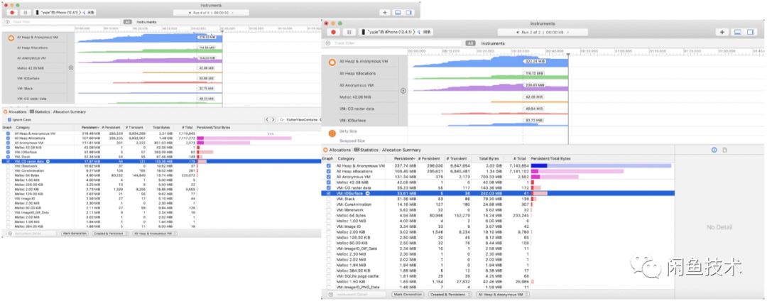 为了兼容这个页面逻辑,并且尽量避免多次创建或销毁surface,我们重新梳理了页面的生命周期,只在viewDidAppear的时候重新创建surface,而在viewDisappear的时候仅对非前台VC进行删除surface。但尽管如此,受限于FlutterVC固化了surfaceUpdate的调用,这里还是难以避免会多重复一次创建和销毁surface。不过,内存略有改观,线上稳定性得到不少提升。见下图内存比较。