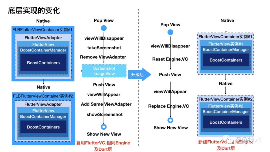 新版不再维护单一的FlutterViewController(或FlutterView),而是和原生一样每次有新页面请求时就直接打开新的ViewController或者FlutterView,和管理原生的页面一毛一样。如此,自然也不需要实现截图功能,小伙伴们再也不用担心通过CPU截图导致白屏或者黑屏的困扰啦。我们看如下页面结构前后的对比。 如上图,升级前全局只有一个FlutterViewAdapter(其实是FlutterViewController),负责FlutterView渲染子View并将其内嵌在每个FLBFlutterViewContainer(继承自UIViewController)中,每次新的FLBFlutterViewContainer拉起时就需要复杂的detach和attach操作来转移唯一的FlutterView,同时进行截图缓存。升级后,不再需要内嵌的FlutterViewAdapter和Screenshot缓存列表: