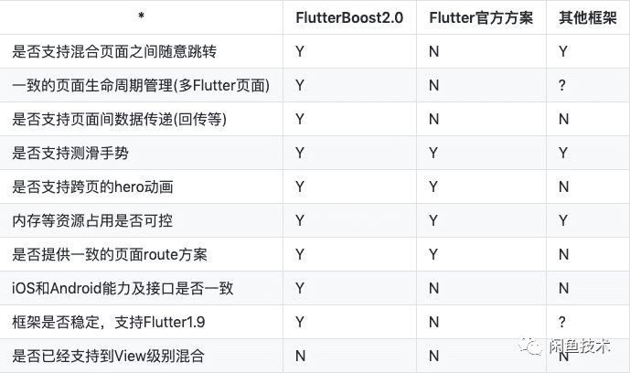 FlutterBoost完善了之前的ContainerLifeCycle,在Dart层能较好的支持页面的appear和disappear事件,同时能监听app切到Background或者Foreground事件。如果涉及到页面的生命周期管理,建议您使用FlutterBoost.singleton.addBoostContainerLifeCycleObserver()来注册相关事件监听程序。社区同学也给了不少建议,比如帮忙优化了hero动画的能力等。其他功能提升及使用上的建议。为了整个框架更稳定和易于回归验证,我们也补了一些单元测试。目前主要是Dart层面的用例(覆盖率达70%左右),后续会增加混合页面跳转方面的用例。同时定义了升级计划和release清单(见首页)。在这轮升级后,我们总结了目前FlutterBoost的能力对比表,供参考: