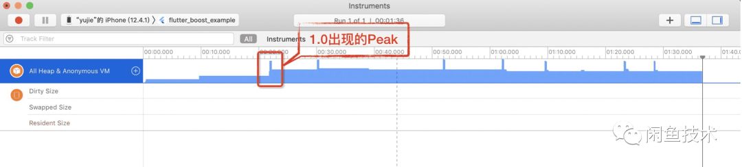 FlutterBoost1.0受限于Flutter的架构,出于节省内存的考虑,全局只有一个FlutterViewController。同时在混合页面滑动切换的时候,为了快速显示上一个页面并实现原生页面切换的效果,采用CPU截图的方式为每个页面保存了打底图。打底图通过文件和内存二级缓存的方式避免持有多张图片的内存问题。但这也带来了一些问题:在切换的过程中因需要对老页面截图及加载之前截图图片等耗时工作,会偶尔出现白屏或者黑屏问题——截图和加载都在CPU线程上进行,会影响主线程渲染;而且在页面切换的时候,截图和加载图片操作虽然处于降低内存的目的,但会带来短暂的内存飙涨(见下图),虽然持续的时间很短,但带来了OOM的abort的风险。