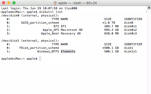 在终端键入如上命令可以看到你的磁盘的Volume Name,如我的Volume Name就是Elements。