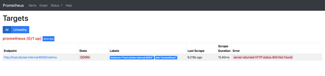 这里的url是仅用作开发目的。如果你面对的是在生产环境中部署好的应用,那么在生产环境中,你也应该拥有一个Prometheus服务器。并且你需要修改相应配置文件prometheus.yml,将这个host.docker.internal改成生产环境中目标机器的域名地址,比如your-prod-application.com。