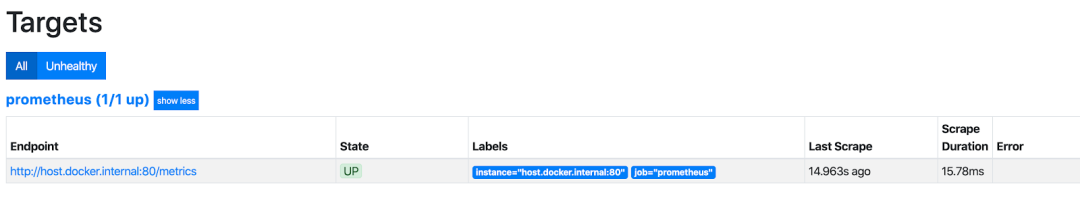 现在你可以到,你的prometheus targets对象会是"UP"状态:http://localhost:9090/targets。