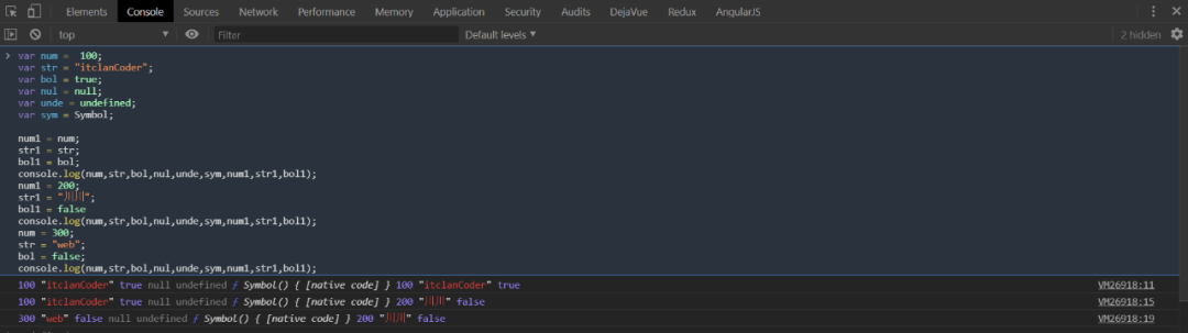 var num = 100;var str = "itclanCoder";var bol = true;var nul = null;var unde = undefined;var sym = Symbol;num1 = num; // 将num赋值给左边num1str1 = str; // 将str赋值给左边的str1bol1 = bol; // 将bol赋值给左边的bol1console.log(num,str,bol,nul,unde,sym,num1,str1,bol1);num1 = 200; // 给num1重新赋值str1 = "川川";bol1 = falseconsole.log(num,str,bol,nul,unde,sym,num1,str1,bol1);num = 300;str = "web";bol = false;console.log(num,str,bol,nul,unde,sym,num1,str1,bol1);