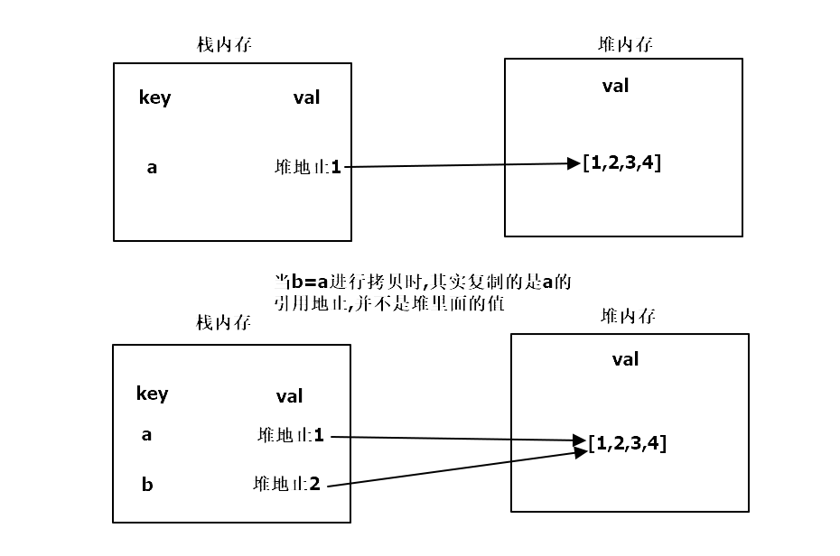 var a = [1,2,3,4]; // 定义一个数组b = a;console.log(a) // [1,2,3,4]console.log(b); // [1,2,3,4]