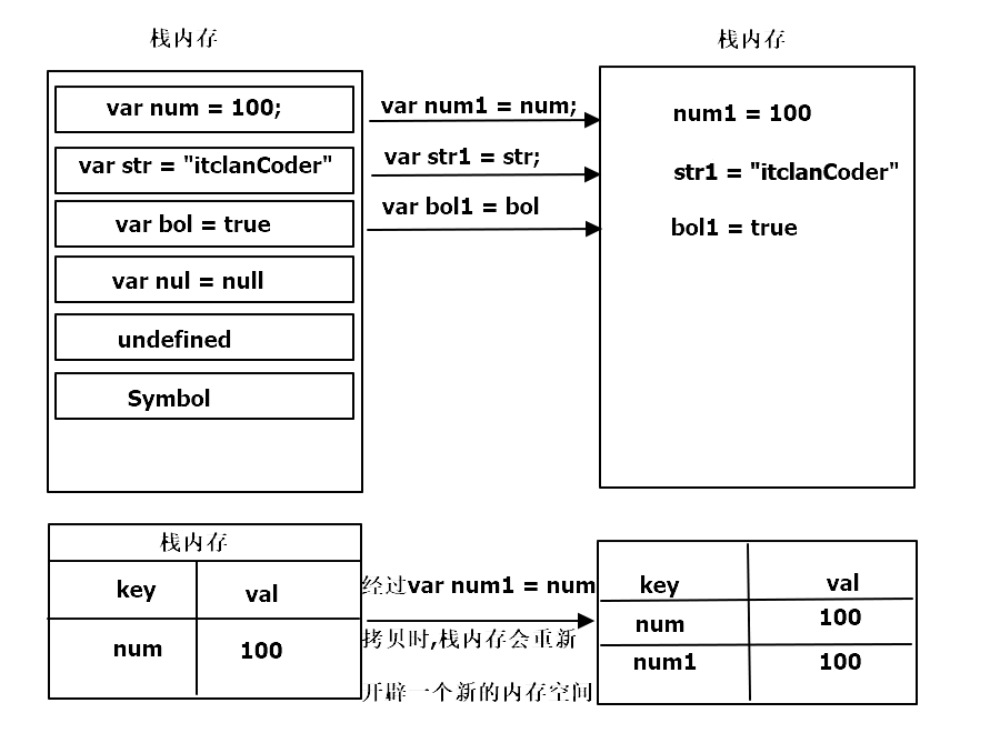 基本类型的数据拷贝,会重新开辟一个空间存放拷贝的值,它是放置在栈中的,这种我们一般称为赋值 如下所示: