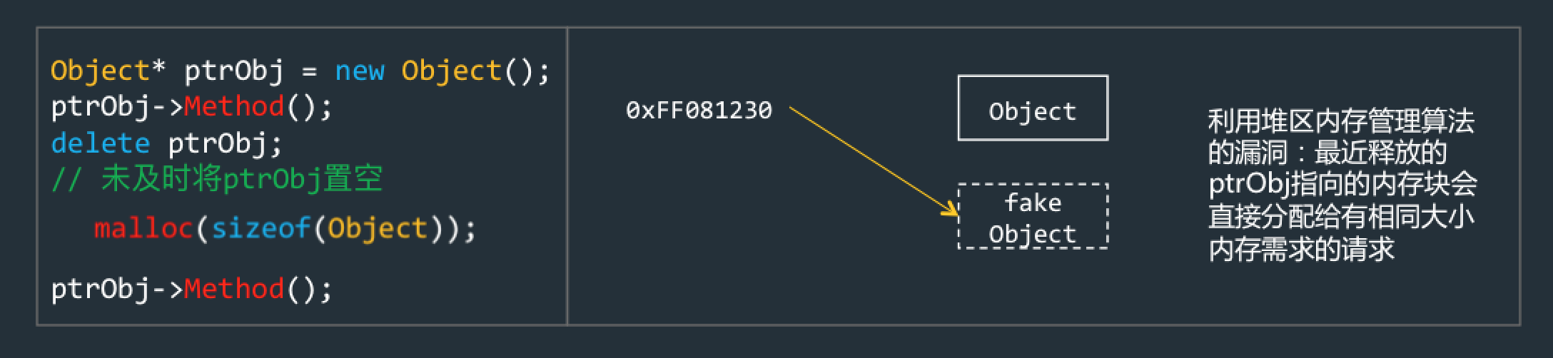 在上面的场景中,如果攻击者在delete对象后,马上又new一个同样内存大小的对象,在现代操作系统的堆内存管理算法中,会有很大概率将这个新的对象放置于刚刚被delete的对象的位置处。这个时候还通过原来对象的指针去访问,将出现鸠占鹊巢,出现可怕的后果。