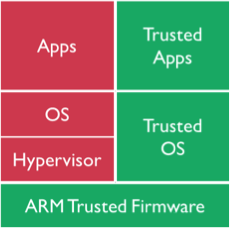 在移动端,ARM芯片占据了主流市场,ARM芯片提供了名为TrustZone技术的技术,在硬件层面新增一个可信计算环境,包含一个可信OS,和一些可信APP,和普通环境在硬件层面隔离,处理器内部进行通信完成两个世界的交互。
