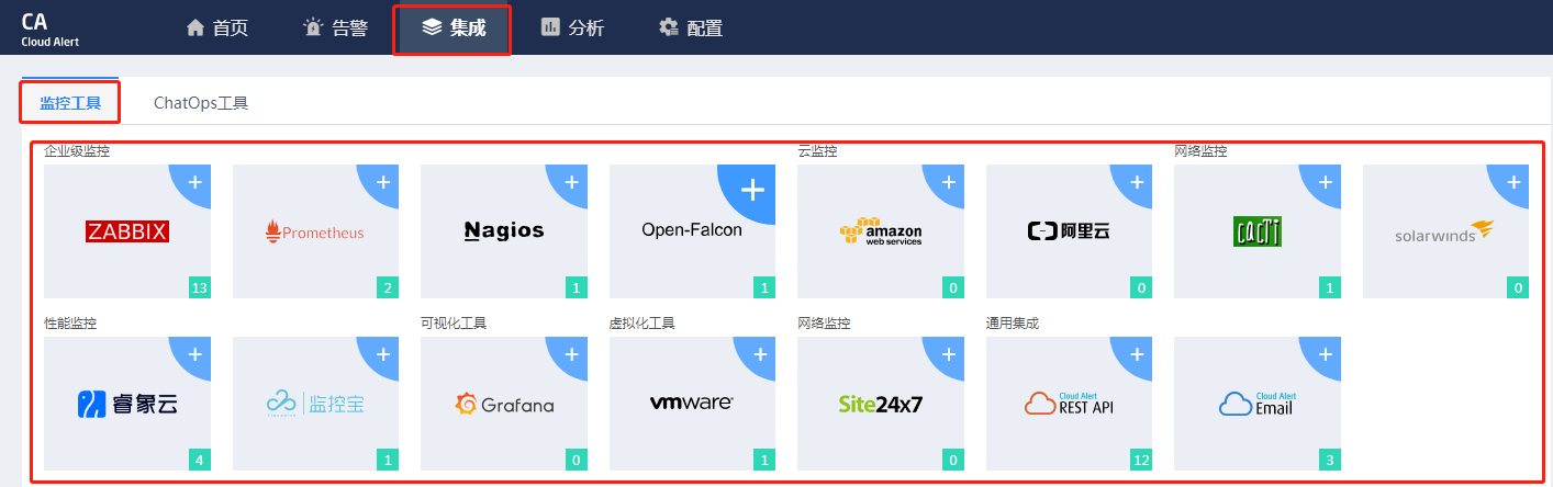 进入Cloud Alert,点击集成-监控工具,选择您的监控工具进行集成,目前支持的有Zabbix、Prometheus、Nagios、Open-Falcon、AWS、Cacti、solarwinds、睿象云、监控宝、Grafana 、Vmware、Site24x7、如果上述都没有支持你的监控系统,那还可以用通用集成rest api和邮箱集成。