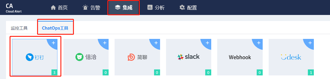 5.回到CA界面,点击集成-ChatOps工具-钉钉