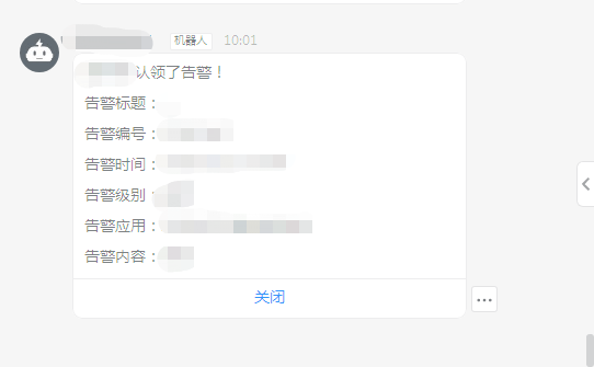 用户可以直接在钉钉中认领告警或者是关闭告警。在认领后和告警关闭后均有通知。