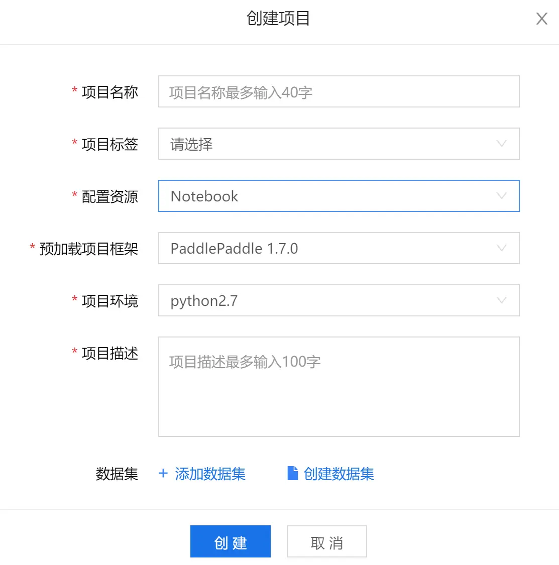 回到首页,选择数据集,创建数据集,上传数据即可。最多上传10个文件,单个文件不超过10GB,文件名长度<= 18。上传完毕以后把数据集挂载到项目下(进入项目选择修改,然后挂载数据集即可)。