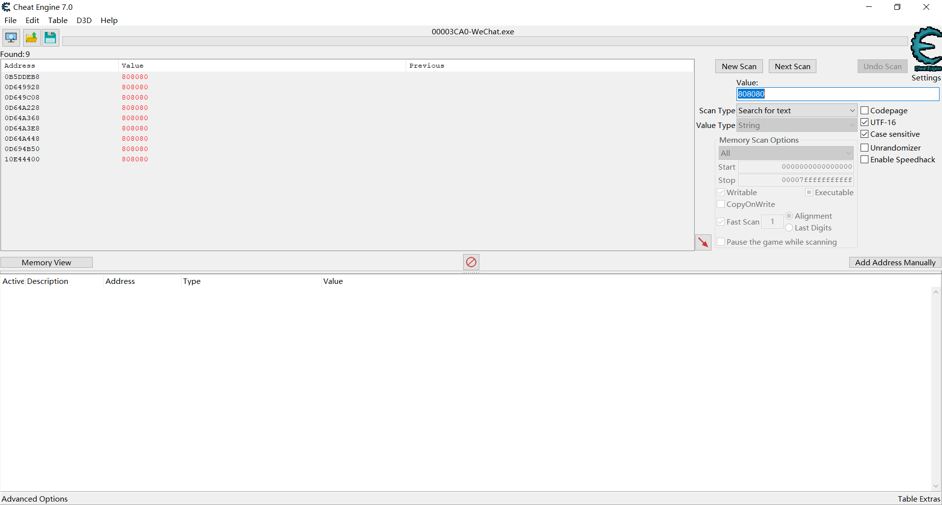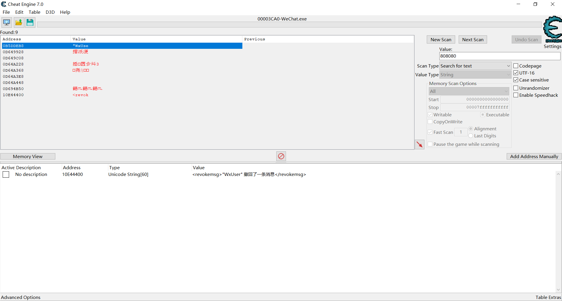 用另一个微信号给在电脑登录的微信号随机发一条消息,勾选UTF-16选项,然后在CE中搜索消息内容