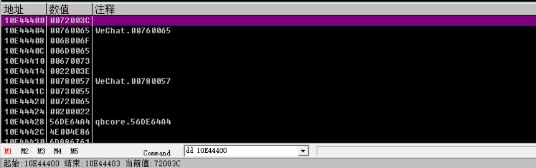 打开OD,附加微信进程,用dd命令定位到上面的那个地址