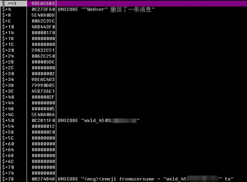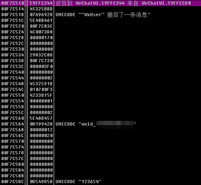 下好断点后再把消息撤回,此时断点被触发,微信被断下,断下后,删除内存断点。在堆栈里寻找我们想要的内容,看到一个包含撤回提示,wxid和撤回内容的call