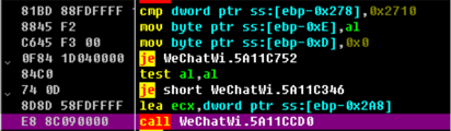 在反汇编窗口中跟随这个call,点击这个call,按F2在该call下断点,按F9继续运行。再给在电脑登录那个微信号发一条消息并撤回,该call断下