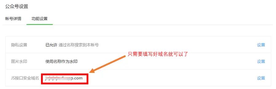 先登录微信公众平台进入"公众号设置"—>"功能设置"里填写如下的JS接口安全域名 备注:登录后可在“开发者中心”查看对应的接口权限。
