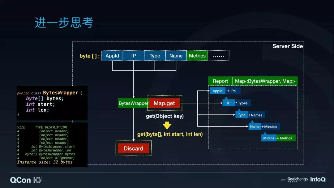 其实我们就是为了想直接用字节流里面的数据来做比较,为什么要创建这样一个对象呢?关键的问题就在这里。因为 HashMap 需要一个 Object,通过这个 Object 里面的 Equals 和 HashValue 来做比较。那如果我有这样一个 Map,它的 get 方法直接接受一个字节流,以及对应的 offset 和 length ,它可以直接帮你进行比较、寻值,是不是就可以避免这个创建对象的损失了?