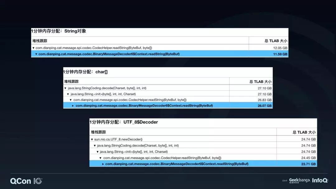 这是从服务端抓出来的一份 Flight Recorder 的数据。可以看到,我们这里一分钟内创建的 String,Char[] 以及 UTF_8Decoder 对象总共有 60 多 G,相当于每秒钟有 1 个 G 的对象产生。如果能把这部分的内存节省下来,系统能够运行得更好。
