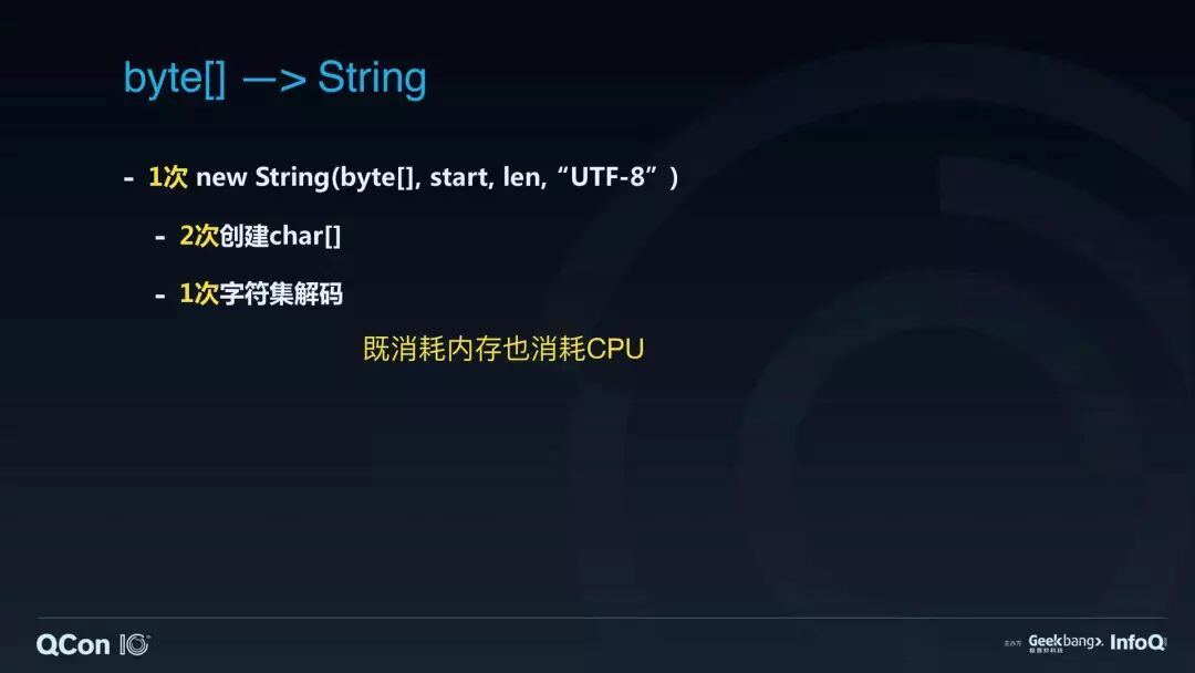 这个操作到底有多大的损失?翻看一下 JDK 代码就可以发现,就这么一个简单的字符串构造,看起来很简单的一个构造函数,实际上它里面做了两次 Char 数组的分配,还做了一次字符集的解码,将字节流变成 UTF_8 编码的 Char。所以仅仅只是这么一个简单的构造函数,既消耗内存和也消耗 CPU。