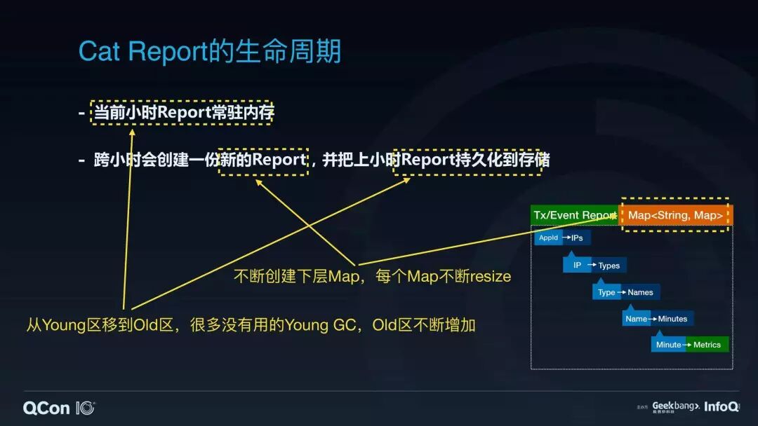我们看到 CAT 的当前小时的报表是常驻在内存里面的,到下个小时持久化完它就可以释放掉了。从这个地方我们可以看到报表生命周期的第二个问题,一个报表一开始创建时在 Young 区,随着监控指标不断过来,报表会不断扩大。这个报表会不断地被 Young GC 扫描到,但是由于这个报表是常驻内存一小时的,所以其实这些 Young GC 都是没有用的。当 GC 次数达到阈值后, Young GC 还会把它搬到 Old 区。那么这份 Old 区里面的报表到了下个小时完成持久化之后,就会变成一份没有用的报表,导致 Old 区里面就无缘无故多了一份没有用的数据。