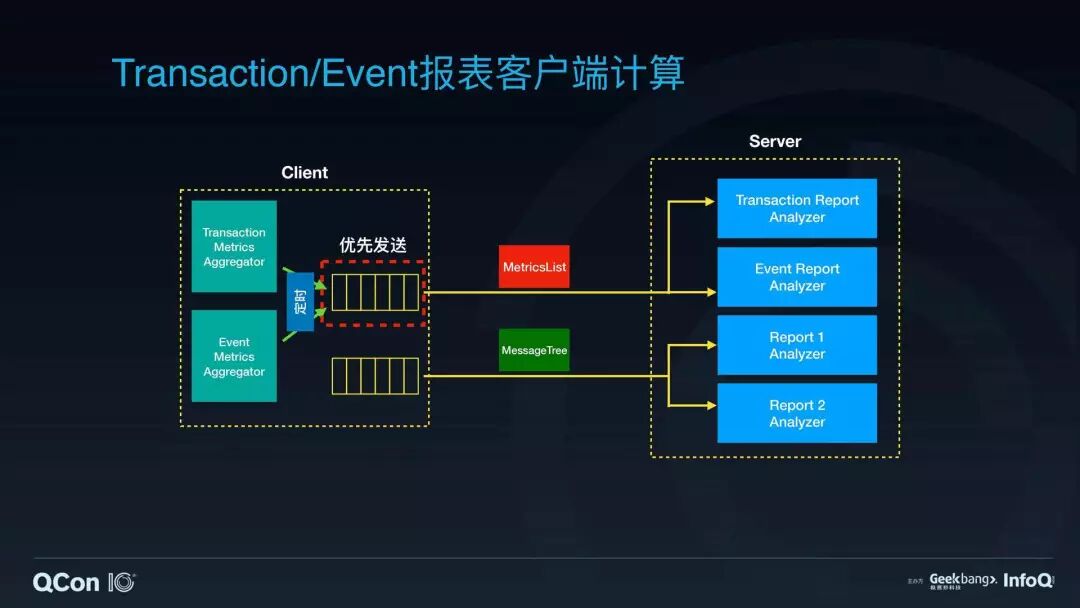 这种计算方式下,计算量只会和客户端数量以及客户端发送这份统计数据的间隔时间有关系。看看最后改造出来的架构,客户端增加了两个用于进行统计的 Aggregator 分别来计算 Transaction 和 Event 的指标,然后再将这些数据定时发送到服务端去。