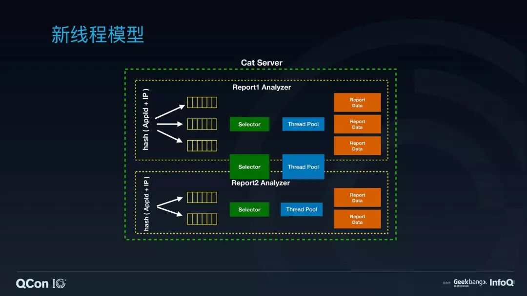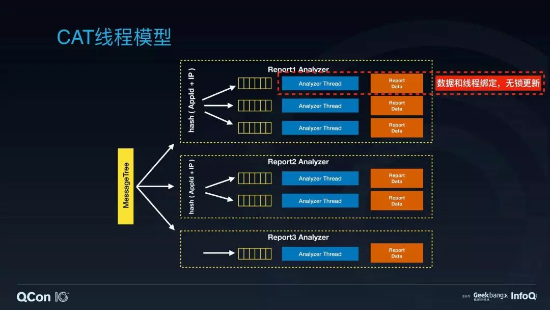 CAT 客户端的监控数据发送到服务端后,服务端会同时将这份数据分发给多个不同用途的报表分析器,报表分析器内部会根据这个监控数据的客户端信息(APP ID 和 IP)计算一个哈希值,然后再分发到报表分析器内部的一个队列里面。这个队列后面会绑定一个线程进行实时分析,计算出来的结果会放到这个线程绑定的内存报表中。这种模型有一个好处,就是它把数据跟线程绑定在一起,使得对同一个客户端过来的监控数据的实时分析、计算和内存报表的更新都是无锁的。