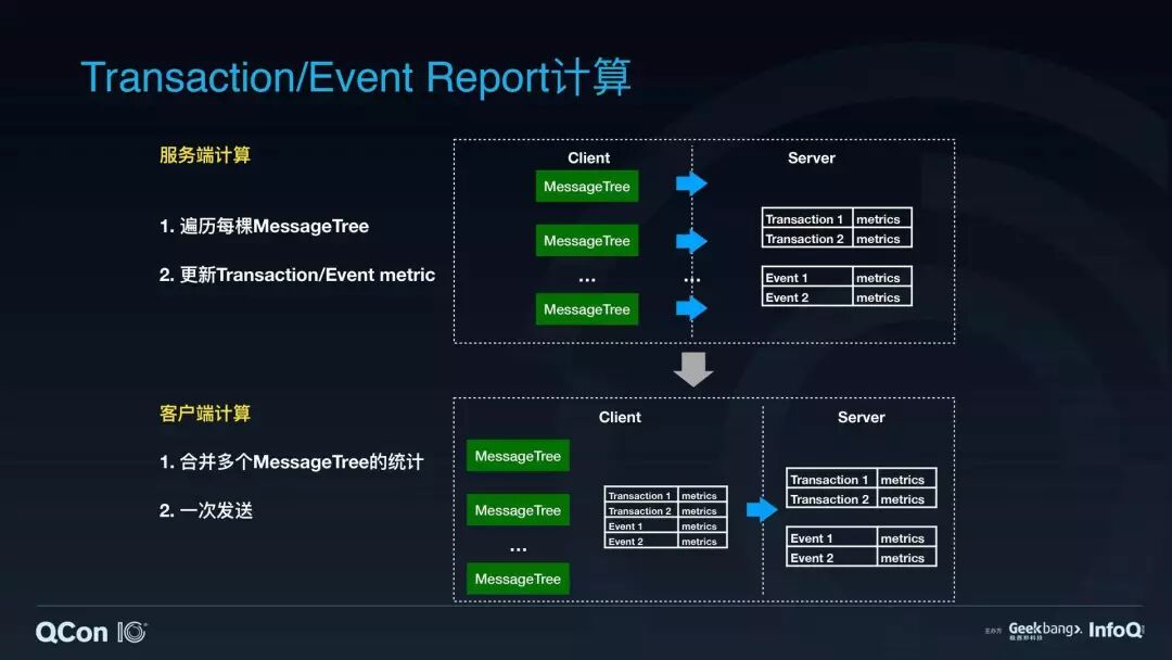 首先,看一下服务端的计算方式。客户端会把一个个监控数据组织成 MessageTree ,以一种树状的结构发送到服务端。服务端会遍历所有发送来的 MessageTree,找到树里面嵌套的 Transaction 和 Event 结点,然后做一个数值的统计。这个计算量是非常大的,它不仅会跟客户端发送过来的 MessageTree 的个数有关系,还会跟每个 MessageTree 里面到底有多少个 Event 和 Transaction 也有关系。