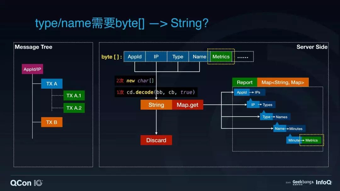 可以看到这 Transaction 和 Event 里面有四个字段都是字符串的: type,name,status,data。字节流反序列化成 MessageTree 的过程中会把这个 Tree 里面的每个 Transaction 和 Event 里的这几个字段做一次反解的操作。