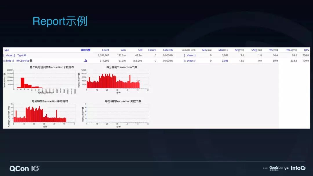 我们的报表是什么样子的?这里是一个 CAT 最基本的 Transaction 报表截图,可以把它简单理解成一段时间内的一些监控指标的聚合。这个例子里面展示的是 RPCService 这个 Transaction 在这一小时内每一分钟发生的次数、平均耗时、每分钟的失败以及这个小时的平均耗时,99 线、95 线。