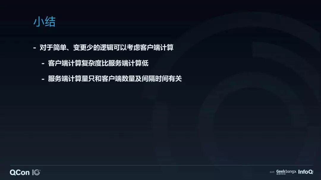 那么到底什么样的计算比较适合放到客户端?首先,一定要是一个不变的,或者是变的很少的逻辑。否则每次更新计算逻辑都会需要更新客户端,这个过程会变得非常的漫长。其次,肯定要是一些在服务端占用 CPU 资源比较多的计算,否则花了很多力气去改造,最后却只能得到一个不是很划算的效果。