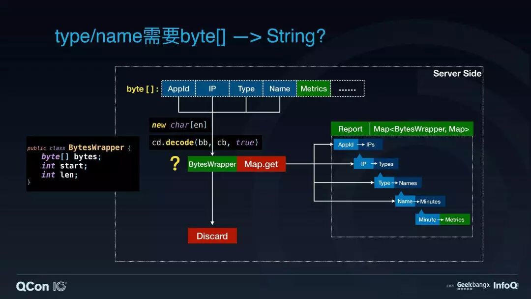 因此,我们针对这个场景重写了一个 HashMap ,它内部通过字节流以及它的 offset 和 length 来计算它的 hashcode 和 equals。这个时候就可以把刚刚这个模型变成了报表里面只有一 BytesHashMap 作为它的结构,我们完全就可以在计算时直接在网络传输而来的字节流上做比较,不会有多引入任何一个对象创建,当然也不会有 discard 操作。现在再回过来看 type/name 这两个字段,它其实也是不需要进行字符串转换的,只要把报表改成 BytesHashMap 这样一个结构,就能够直接利用原始的字节流来完成操作。