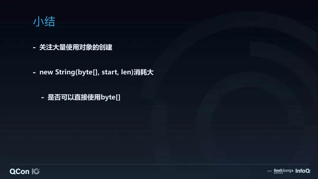 我们一定要去关注代码中大量使用的对象,以及它的创建过程究竟会有多大损失。即使是这个例子中里面这么简单的字符串构造函数,实际上它对我们的内存和 CPU 也有一定的消耗。在这个例子里面,我们通过直接引用网络传输而来字节流进行计算处理就可以避免这些损耗了。