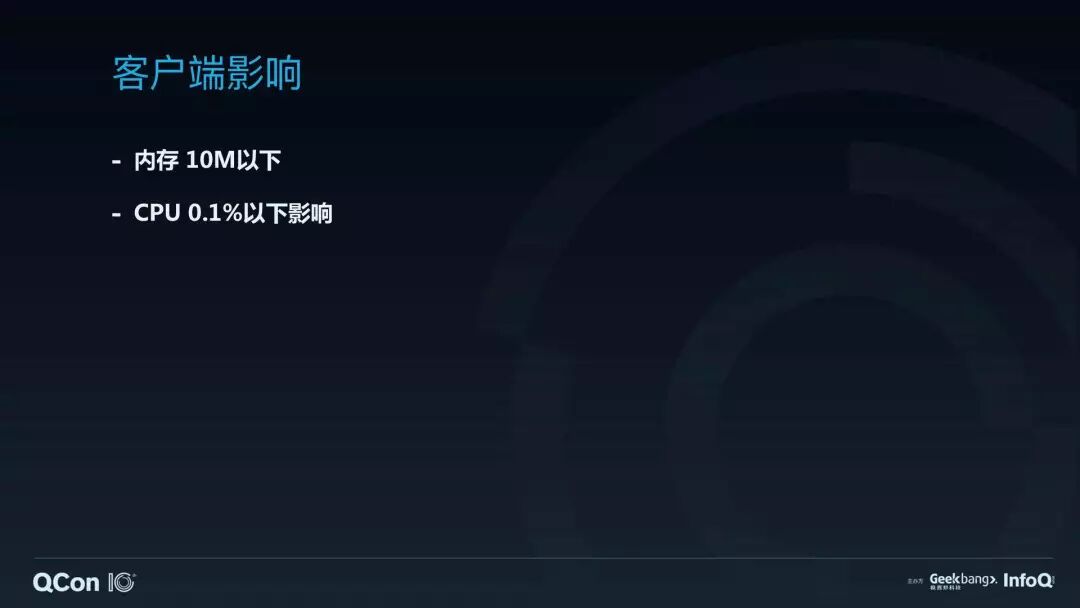 根据我们的统计,整体的内存消耗只在 10M 以下,CPU 的占用则基本上可以忽略。服务端的计算需要对一棵棵监控树进行遍历然后去分析统计,但在客户端这个流程其实是反的。客户端是先有统计数据再组织成树,所以其实只要在产生监控数据的时候,在它埋点结束之后多加一个统计量,而省去了遍历一棵树的消耗,所以它对客户端 CPU 的影响几乎为 0。