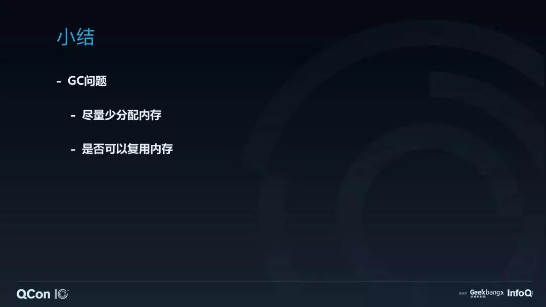 对于 GC 问题可能会想到要去调参数让效果好一点,但实际上根本问题是需要考虑尽量少分配内存,因为不分配内存才是根本诉求。如果一定要把内存创建出来,就得考虑是否可以复用这份内存。