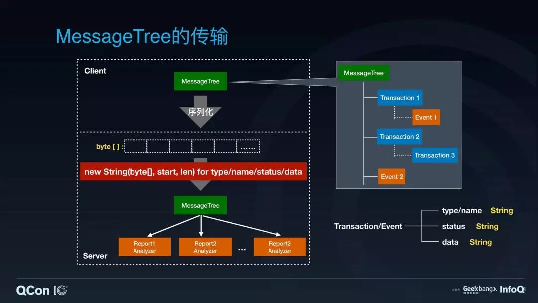 这个问题得先看一下 CAT 里面 MessageTree 的传输过程。首先它会从客户端把 MessageTree 序列化成一个字节流,通过网络传输到服务端,然后服务端会把这个字节流完全的反序列化复原成原来的 MessageTree 再分发给报表分析器去计算。