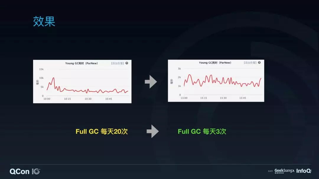 可以看到首先 Young GC 已经达到最开始的期望,达到了稳定的状态,而且因为它根本不用搬动这份大的数据到 Old 区,也不用扫这份大的内存,GC 速度也快了很多。此外,我们的 Full GC 也从每天的 20 次降到了每天的 3 次。