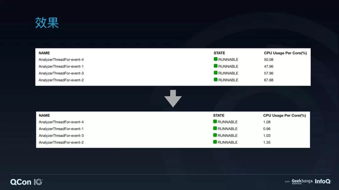 Event 报表也从原来的 4 个线程,每个线程占 0.4、0.5 个核,变到现在 4 个线程,每个线程只能吃掉 0.01 个核。效果还是非常明显的,省了很多资源出来。