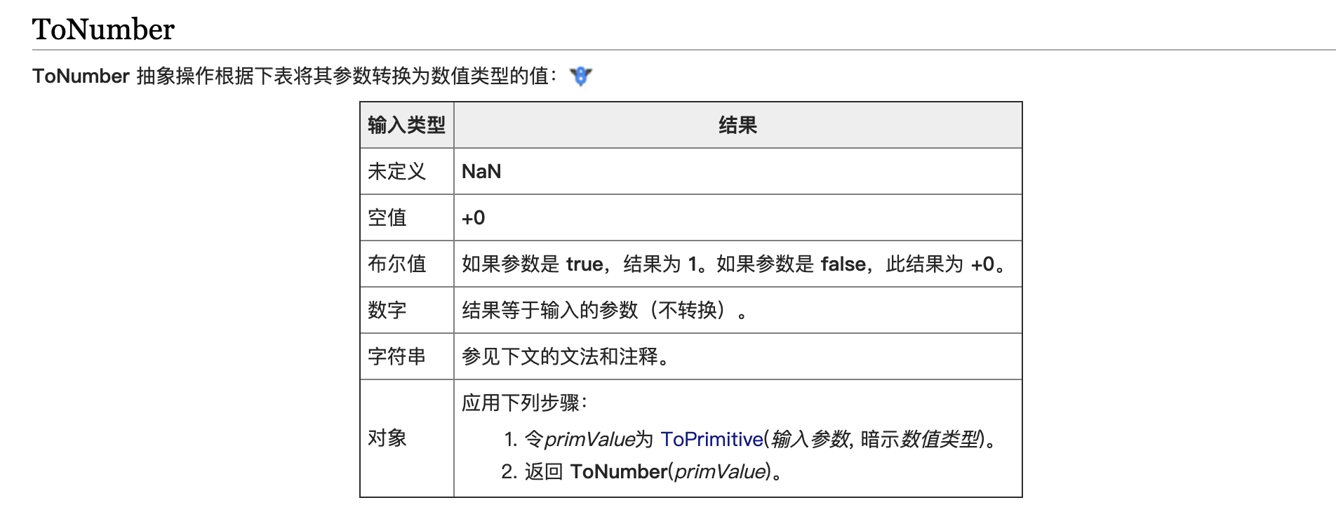 * ToNumber 检查操作数,是对象执行 ToPrimitive(暗示数值) 操作,